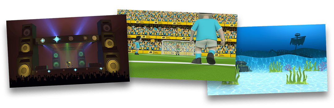 I explored some options and came up with a mixed style I called diorama which TMP worldwide really responded to. It involved having the main characters in the same vinyl style as Bot while the background and props were in a 2D/3D paper style. Simpler objects like blades of grass would be ‘made’ out of thin card in the ‘2D’ paper style; more complex background objects such as the stage and speakers in the rock concert scene were ‘made’ in the 3D paper style; then more important props or objects that Bot would interact with like the football, snowboard or scuba mask would be made in the same vinyl style as Bot.