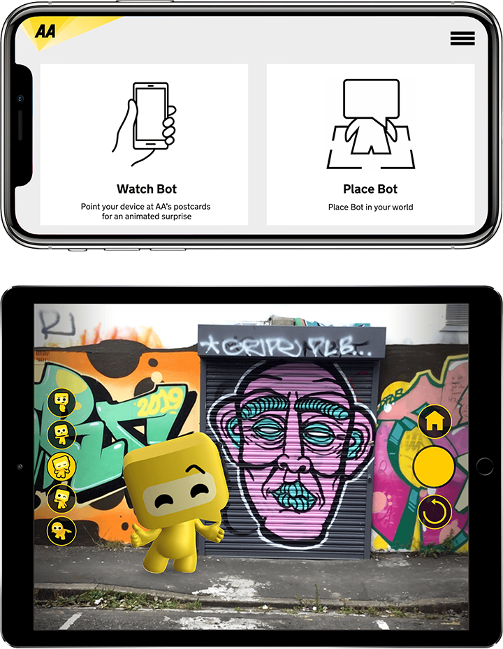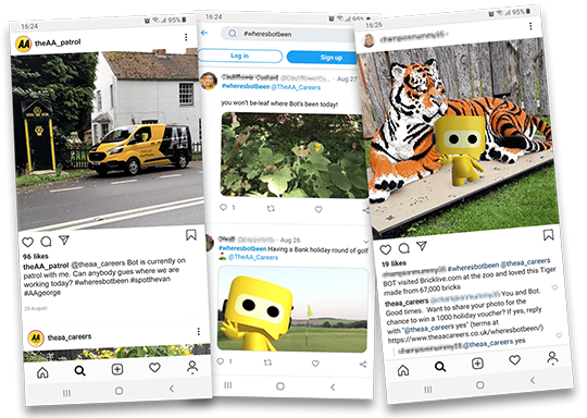 The result was a unique AR app with the capability to record videos and take images of Bot and share these through the social media app of the users choice, something no other AR app seems to deliver. The AA hosted events at shopping centres around the UK to promote the app and launched a competition where users of the app would share their images or videos of Bot on social media using #wheresbotbeen. They had hundreds of entries and some great and imaginative places for where Bot had been.
