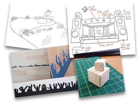 I made some paper examples to make sure the modellers that I worked with were capturing the quirks paper models can create. For example with the crowds in the football and rock concert scenes we wanted the ‘paper’ crowd to slightly warp and bend as thin card would when cut into the proper shape. We also made some 3D cubes and cuboids to study the folds and joins of the paper models.